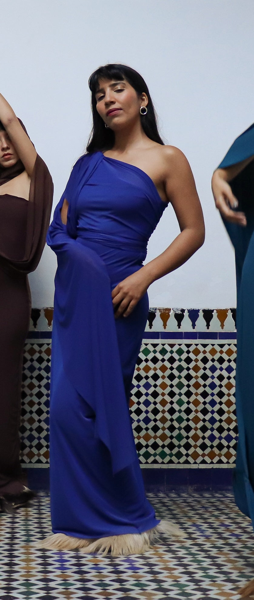 The Merzouga dress is an asymmetrical, one sleeve design, with a long elegant scarf attached at the sleeve. Constructed with a high-quality chocolate brown mesh and lined bodice, the Merzouga dress has versatile styling options for a variety of looks.