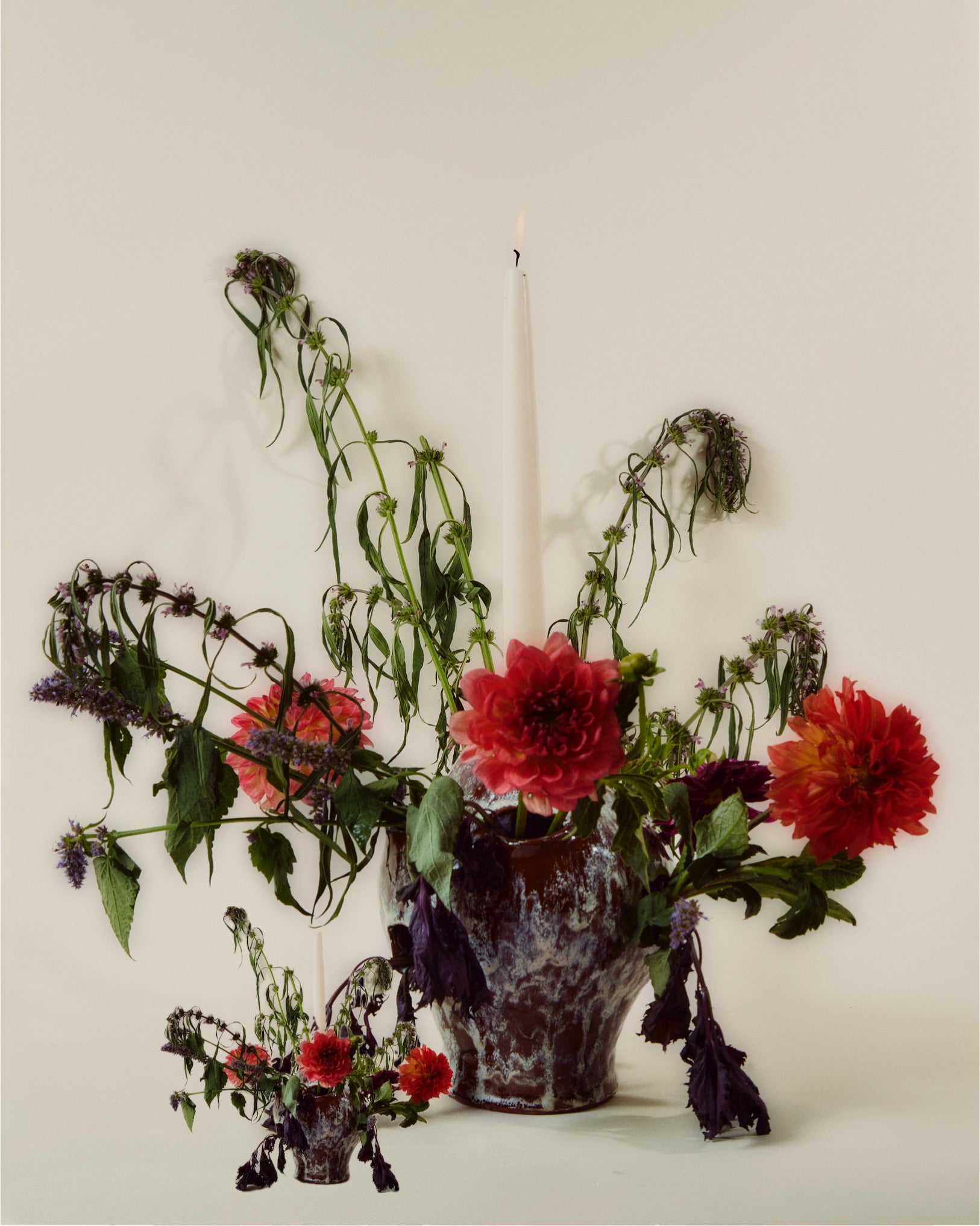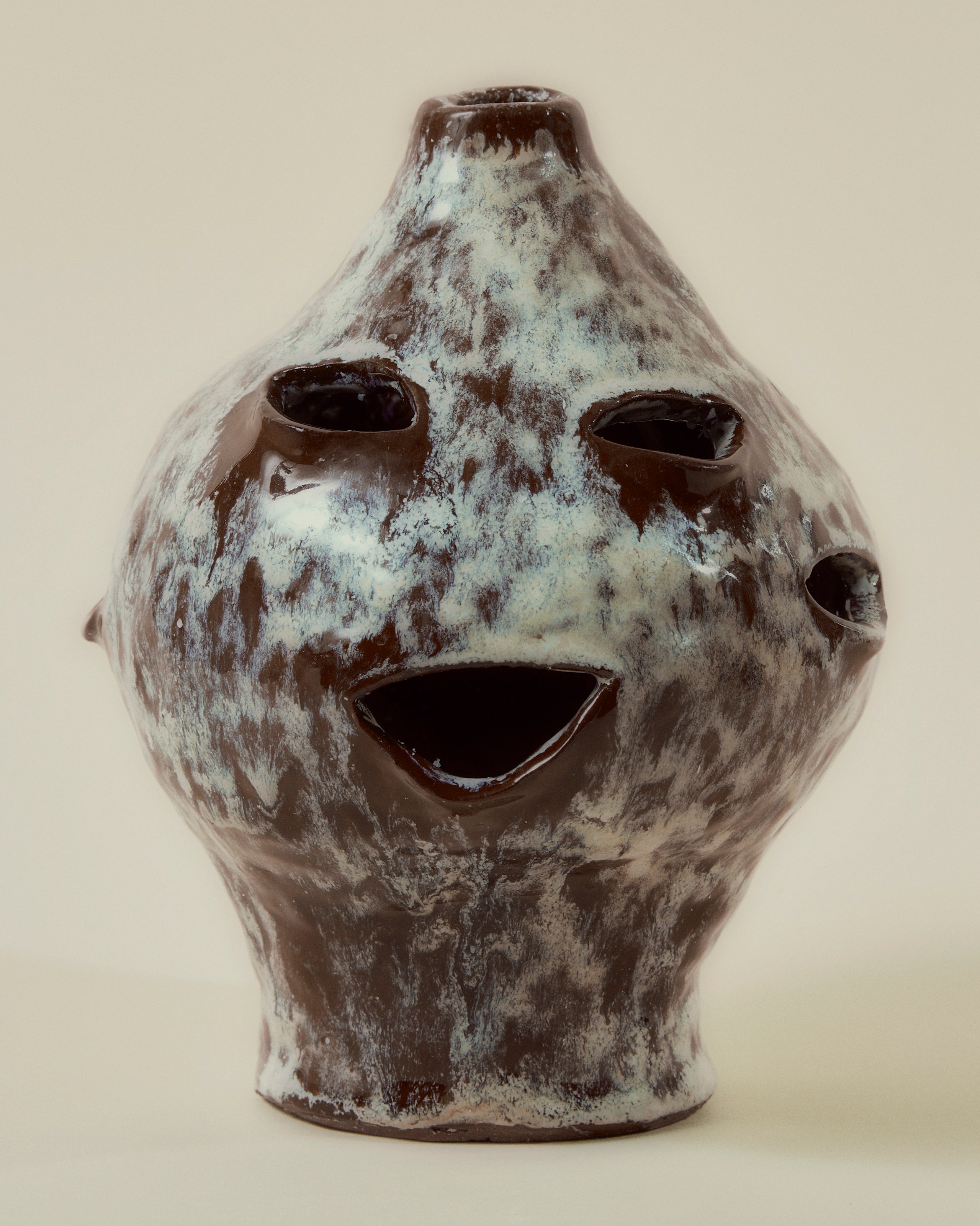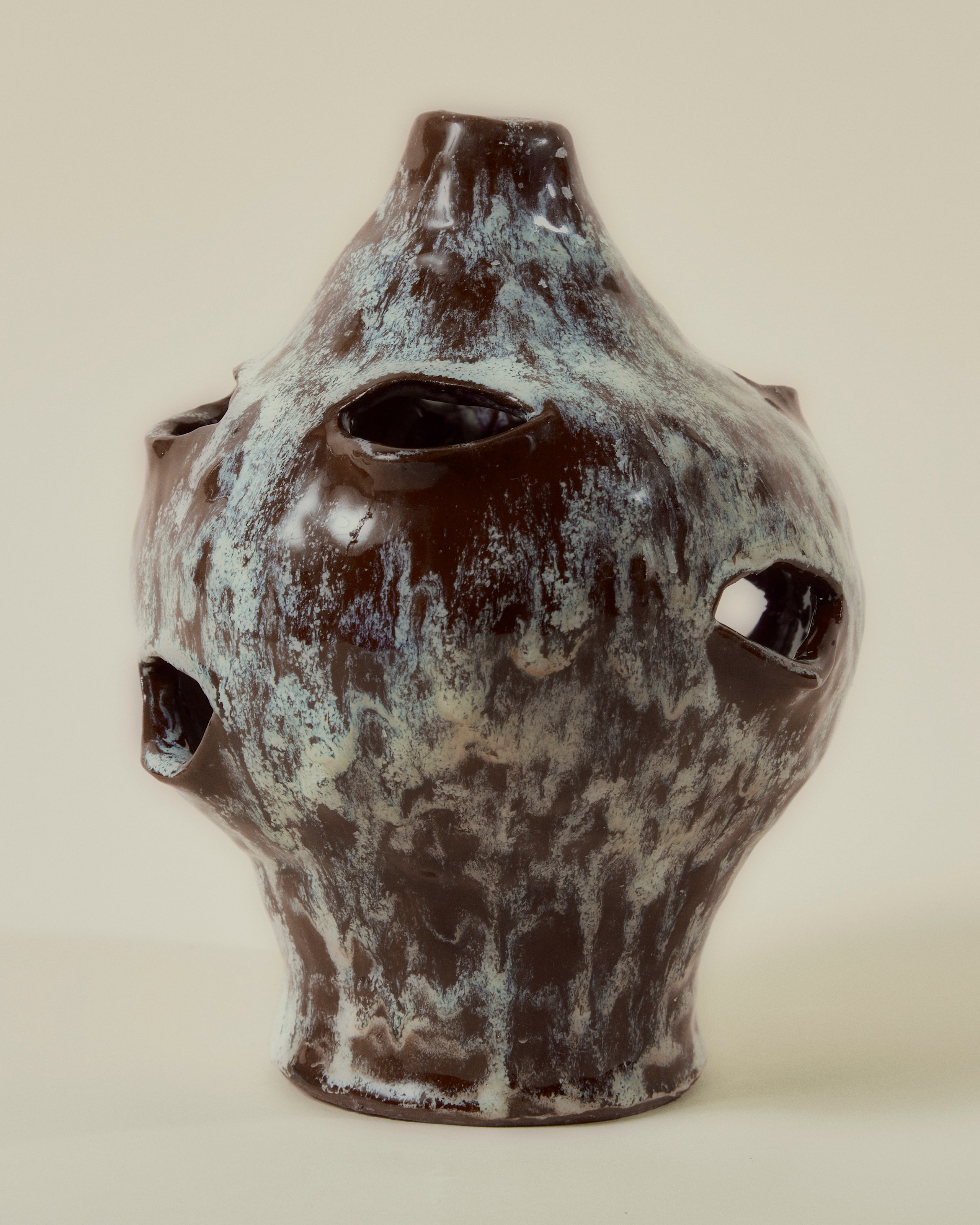 Hand built earthenware sculpture designed as a vessel for flowers and foliage.