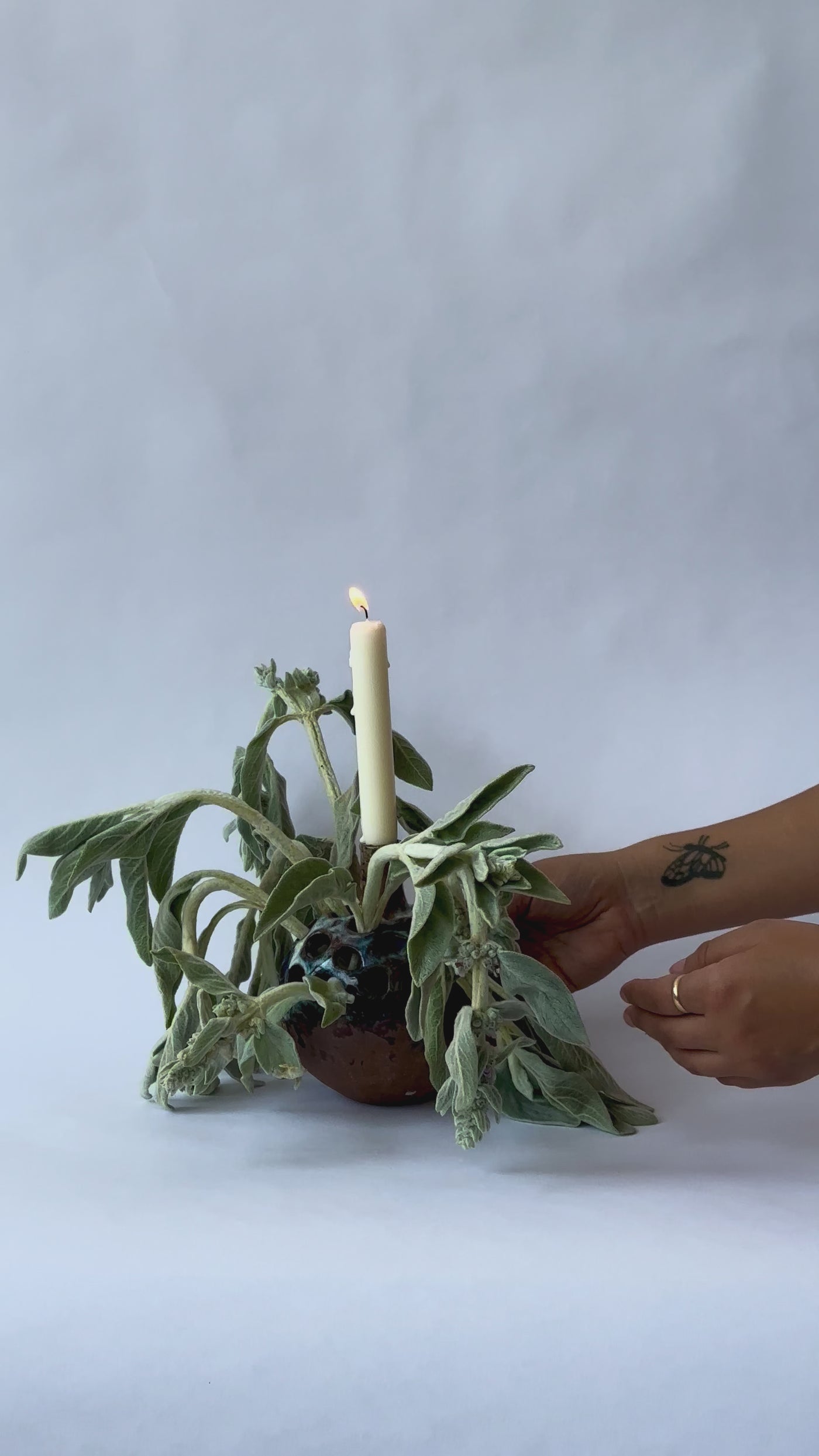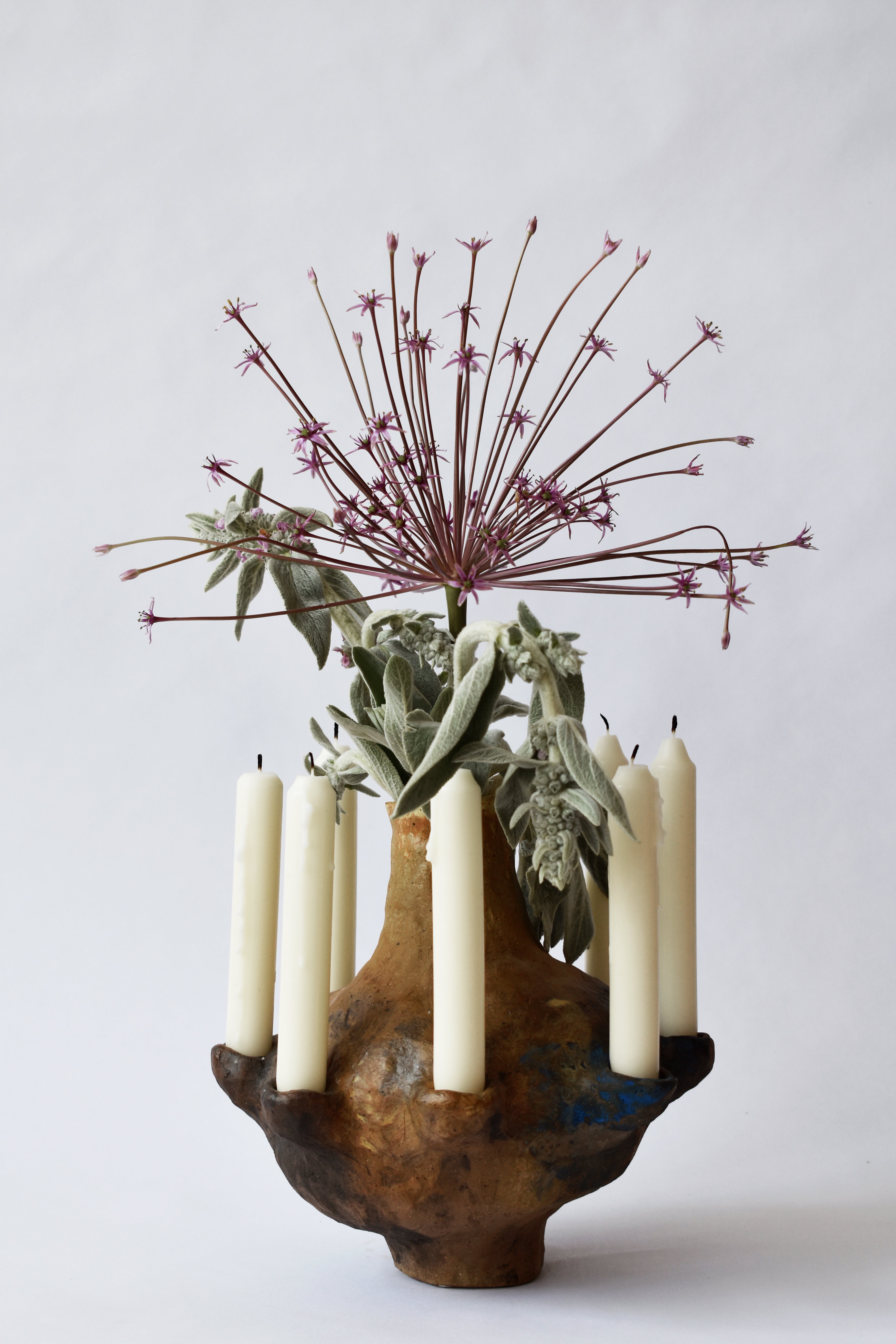 Hand built earthenware clay vessel, designed to be multifunctional. This sculptural piece transitions between liquid containment, ambient lighting, and spiritual practice. This vessel holds 8 taper candles.