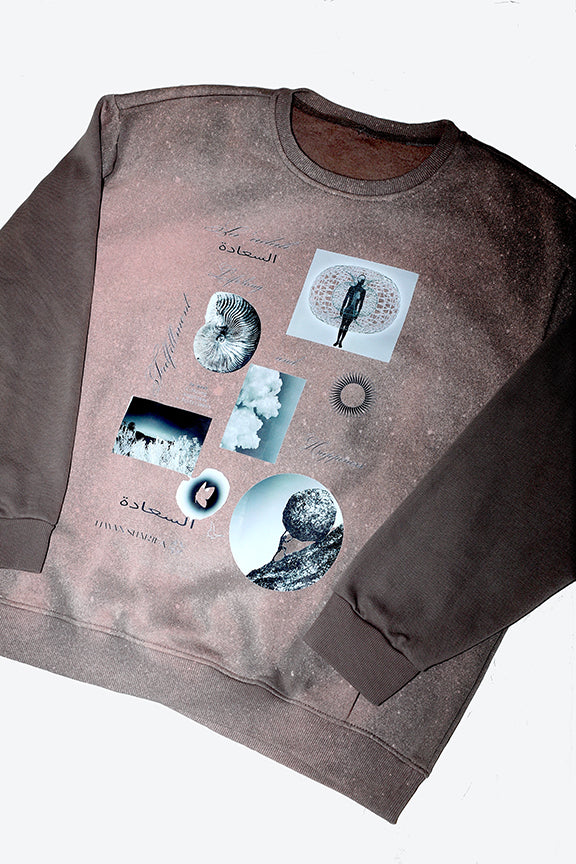 The Fulfillment crew neck is a limited edition printed long sleeve sun bleached shirt defining the word Sa'adah, meaning life long happiness and fulfillment. By seeing these words written on this shirt, we hope you, and those you encounter feel encouraged to pursue Sa'adah. Hand dyed and printed in Marraekch. One of one.