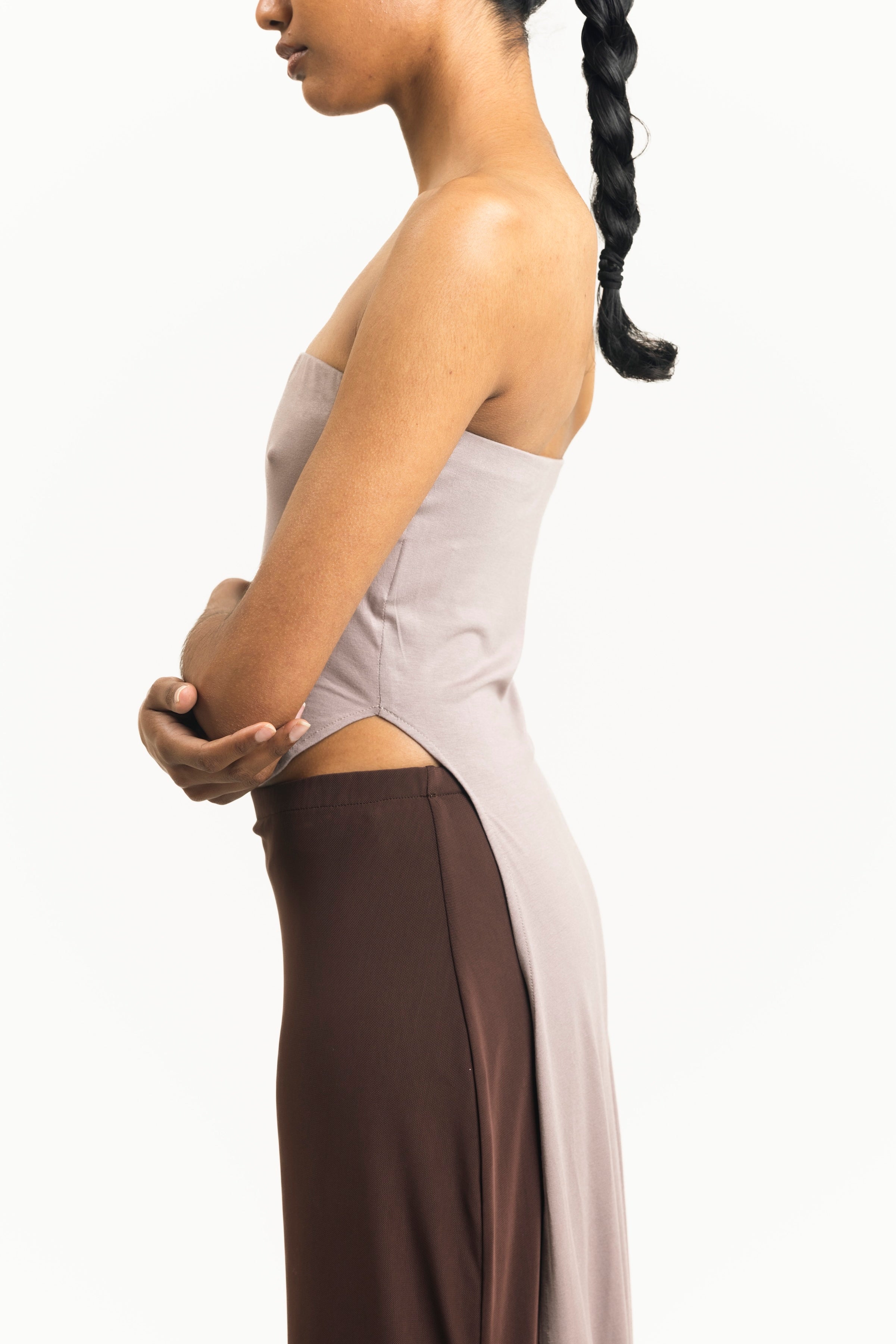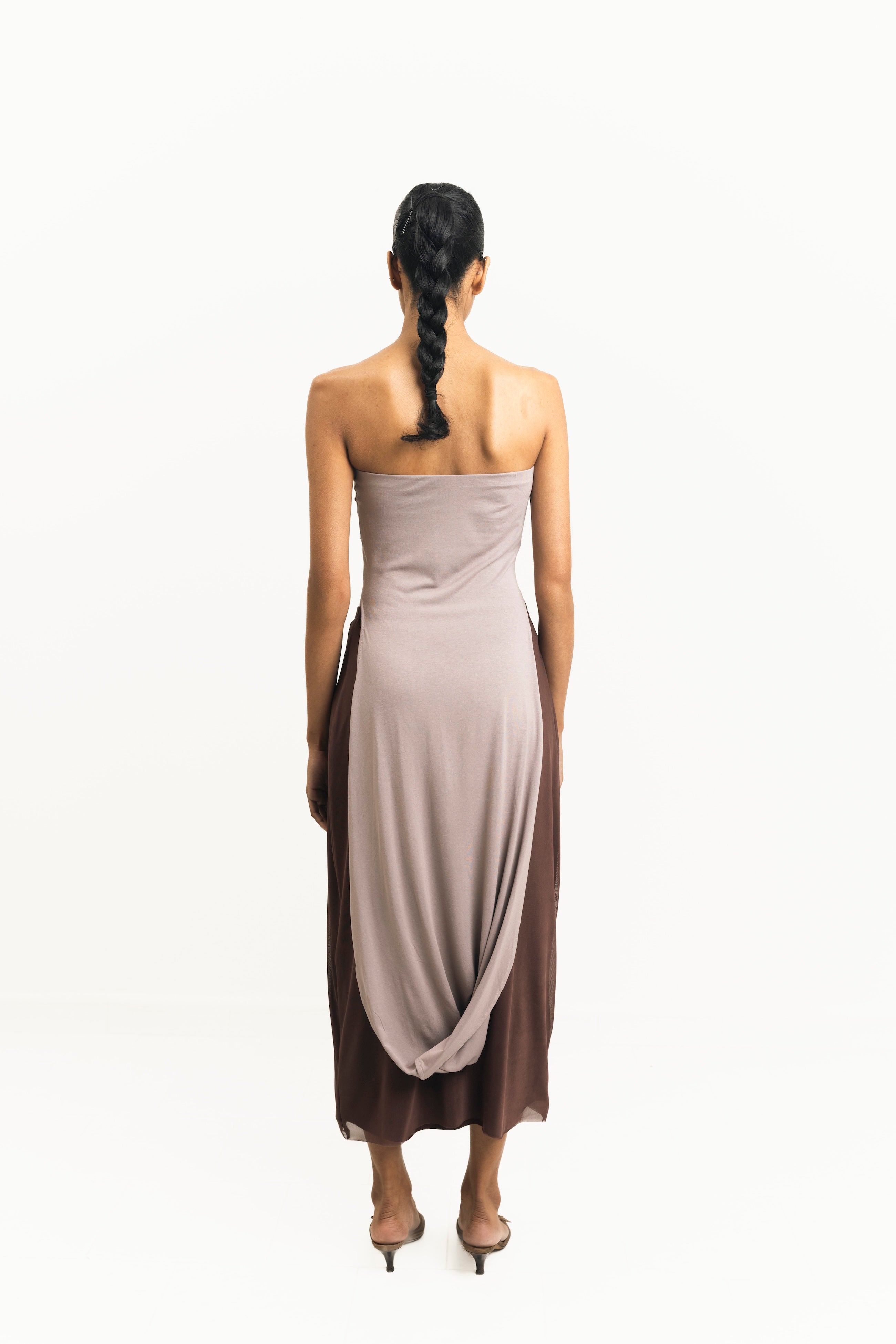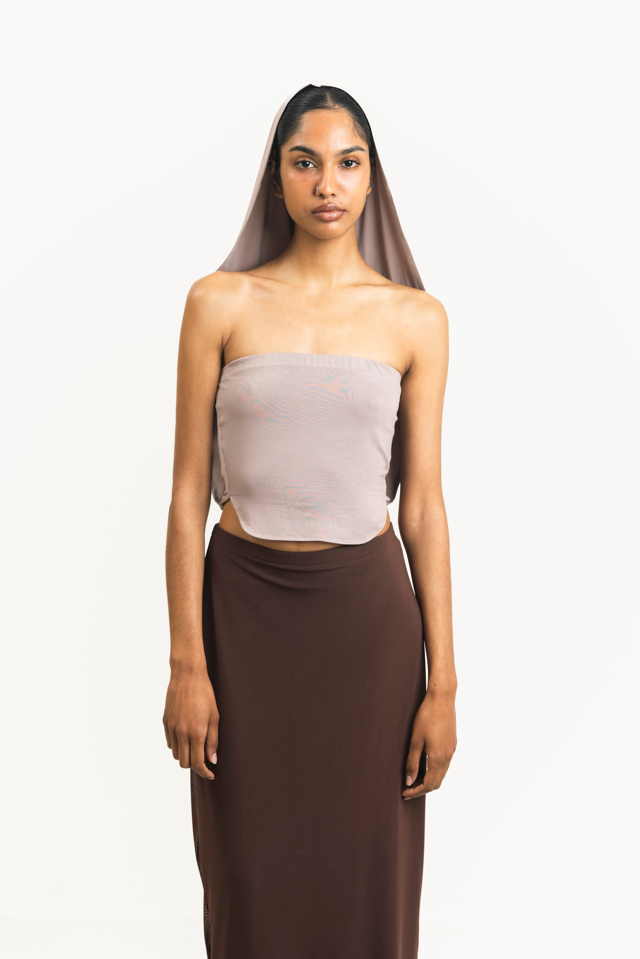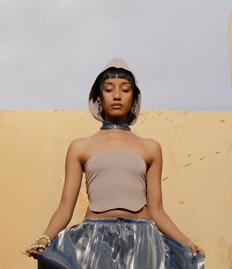 The Reprieve top is a versatile piece that serves as both a hooded tube top and an asymmetrical dress. The folding of the fabric is a reference to the folding of time, and the change of relevance of time from place to place.